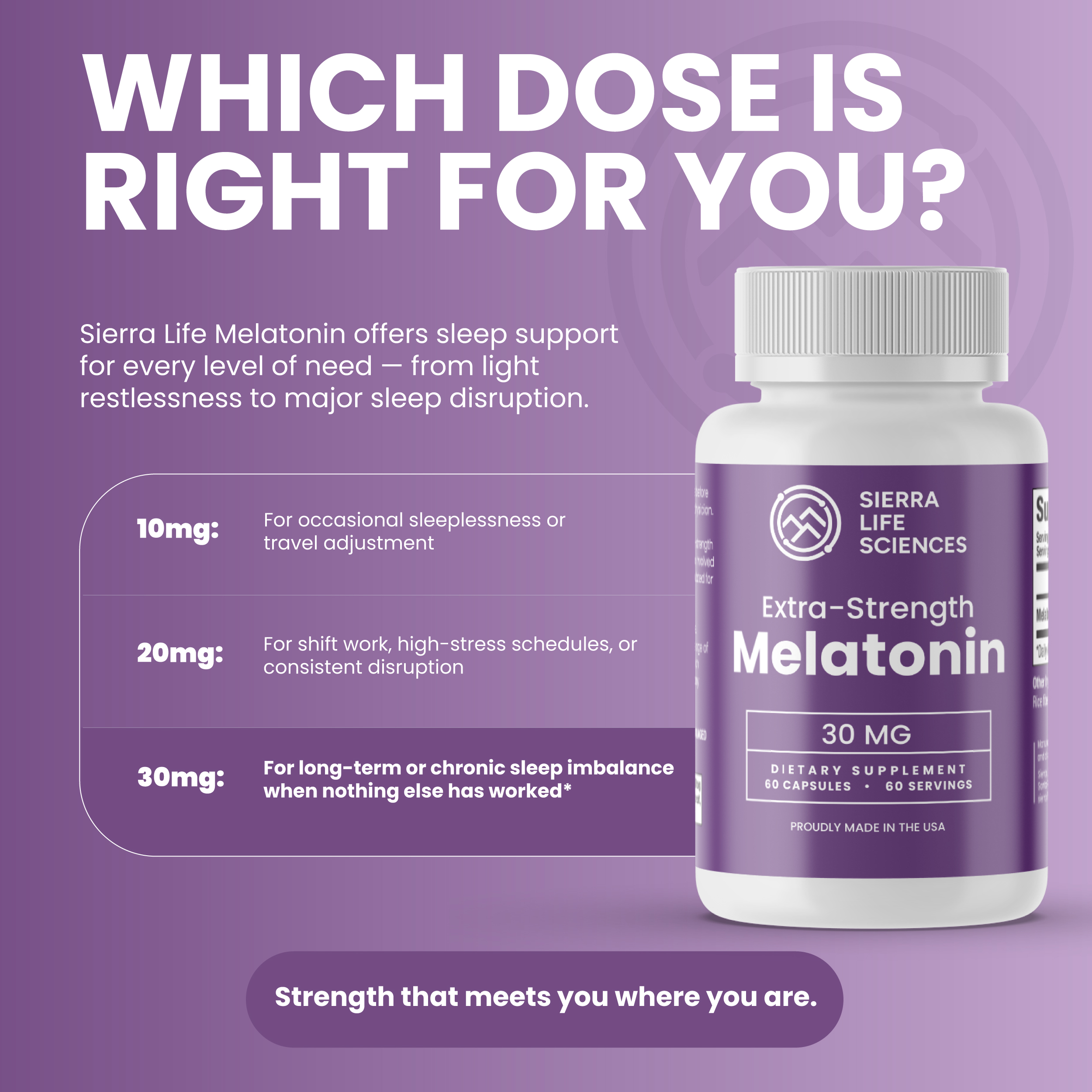Crafted from only the finest, high-grade Melatonin, we prioritize purity and quality in every bottle. Our commitment to excellence extends to our manufacturing process as well. Produced in a facility that is not only GMP Compliant but also FDA Registered, every batch of Sierra Life Sciences Melatonin undergoes rigorous testing. These tests are conducted by independent, ISO-accredited laboratories to ensure that what you receive is nothing short of the best. Designed with your convenience in mind, our capsules are made to be easy to swallow, thanks to their softgel capsule composition, making them a seamless addition to your day. Sierra Life Sciences is dedicated to providing you with premium supplements that integrate effortlessly into your lifestyle, supporting your daily needs without compromise. Discover the Sierra Life Sciences difference today and incorporate a simple, yet effective component into your nutritional regimen.