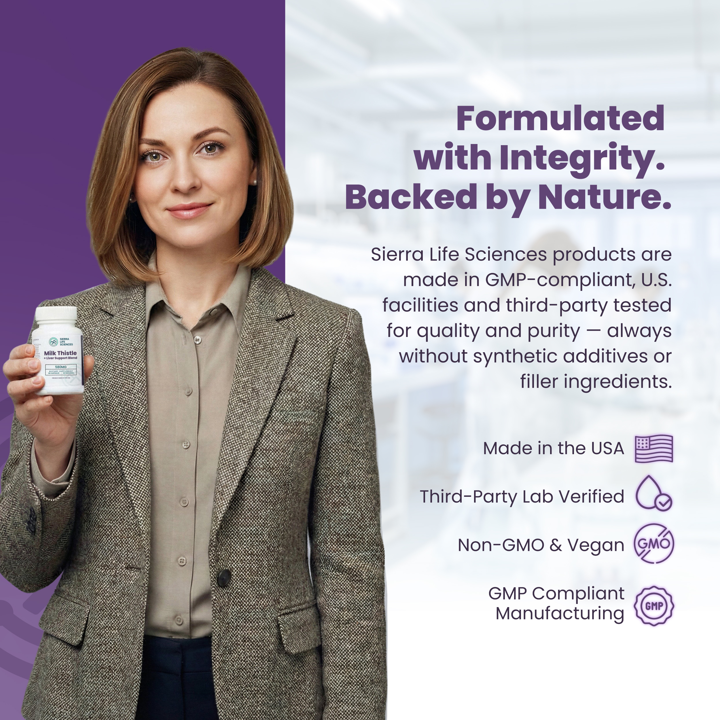 Produced in a facility that is not only GMP Compliant but also FDA Registered, every batch of Sierra Life Sciences supplements undergoes rigorous testing. These tests are conducted by independent, ISO-accredited laboratories to ensure that what you receive is nothing short of the best. Sierra Life Sciences is dedicated to providing you with premium supplements that integrate effortlessly into your lifestyle, supporting your daily needs without compromise. Discover the Sierra Life Sciences difference today and incorporate a simple, yet effective component into your nutritional regimen.